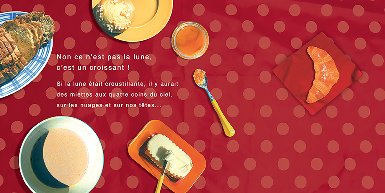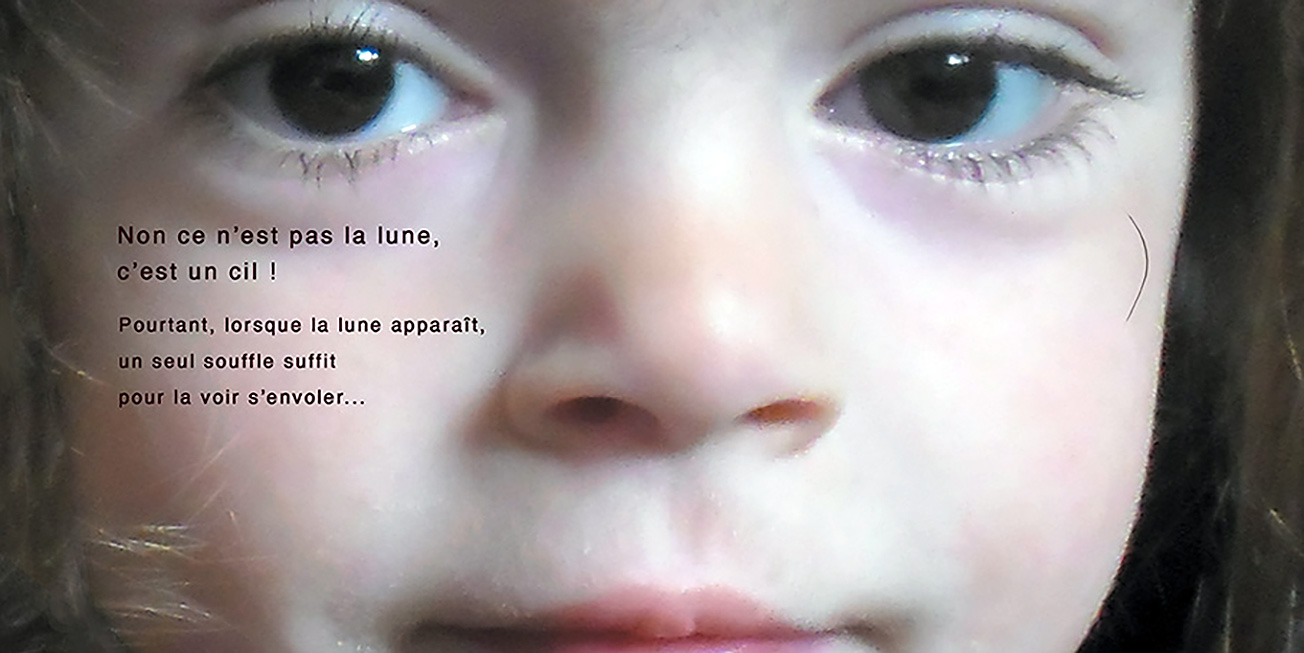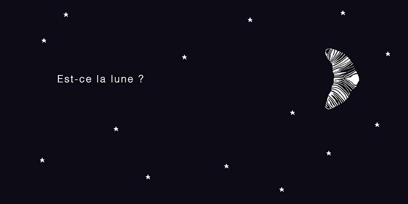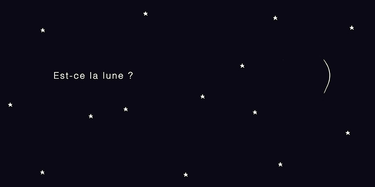 Dans le ciel, apparaissent tour à tour un cil, un croissant, une bulle de savon et bien d’autres choses encore… Est-ce la lune ? Peut-être…